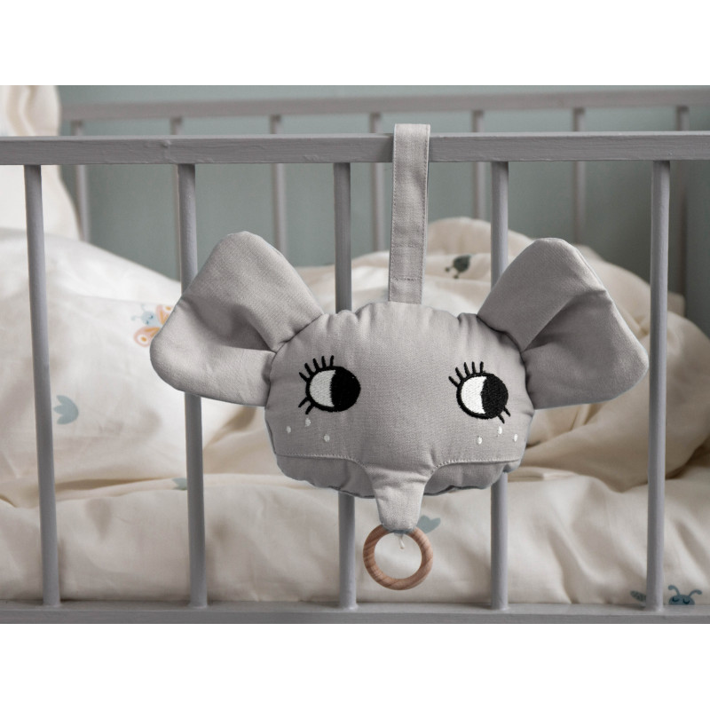 En kul och ekologisk hängande speldosa i form av av ett mjukt elefanthuvud med dragsnöre som går ut genom elefantens snabel. Öglan som man hänger upp speldosan i stängs med kardborreband så att den även kan hängas runt till exempel handtaget till barnvagnen eller spjälsängen. Melodin som spelas är en långsam version av Brahms Lullaby. Torkas av med fuktig trasa vid behov, då själva speldosan inte tål vatten. CE-testad, med en dragring av trä och sydd av 100% ekologiskt bomullstyg samt stoppad med polyester fiber. Storlek: ca 18 x 19 cm.