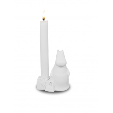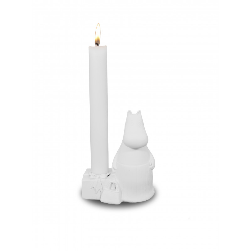 Söt ljusstake tillverkad i matt polystone där Muminmamman står bredvid ett paket. Ljusstaken blir en fin dekoration i hemmet. Ljusstaken med Muminpappan köpes separat.