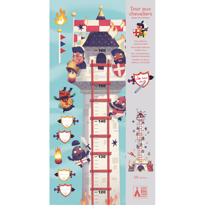 En kul mätsticka i form av ett torn med riddare som försöker anfalla och försvara tornet. Mätstickan har markeringar från 40 till 160 cm, så var lite försiktig när ni sätter upp den och mät upp innan (mät avståndet från 40 cm märket och till nederkanten på mätstickan dra detta mått från 40 cm och markera försiktigt på vägg eller dörr att där ska mätstickan börja). Mätstickan är självhäftande så det är bara att sätta på en lämplig vägg eller dörr. Du får också ett antal mindre klistermärken, både dekorativa och sådana med med plats att skriva t.ex. datum och barnets namn, som du sen kan sätta upp vid barnets aktuella höjd. Innehåll: 40 klistermärken.