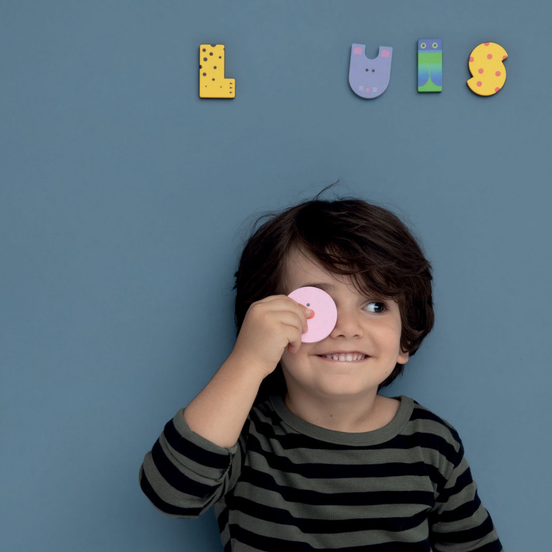 Färgglada och grafiskt designade bokstäver illustrerade som olika djur, tillverkade i trä och målade i giftfria färger. Varje bokstav har två dubbelhäftande fästen på baksidan för enkel uppsättning.