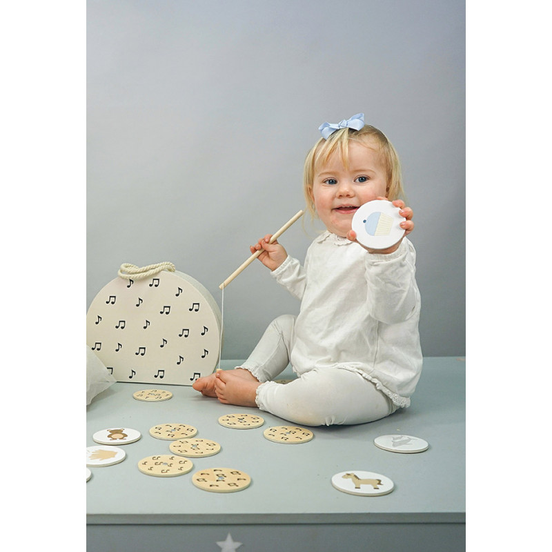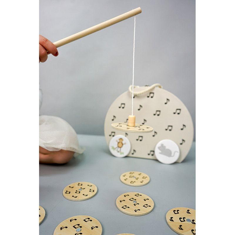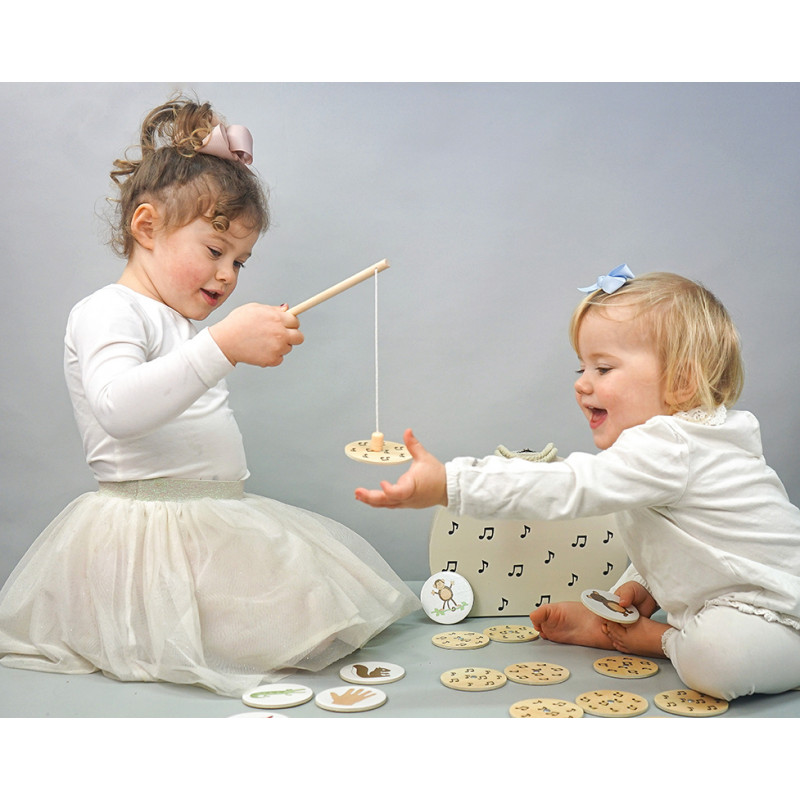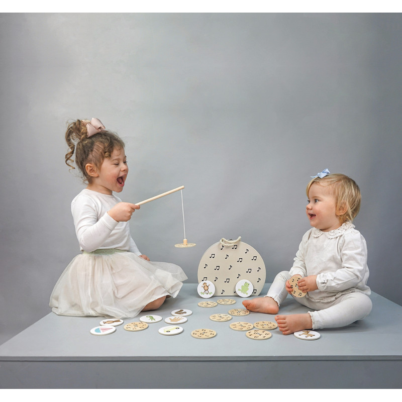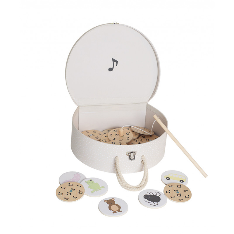 Låt oss sjunga! Jabadabados sångväska möjliggör en mysig och underhållande stund med sång i centrum. Väskan innehåller 23 sångkort som med sina olika motiv representerar olika barnvisor. Det medföljande fiskespöet används för att fiska upp ett sångkort ur väskan, och därefter kan ni gemensamt sjunga den sång vars motiv finns på kortet.