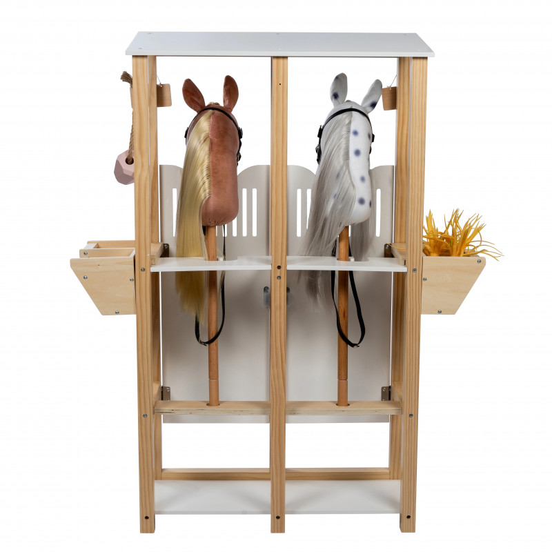 Med sina två spiltor blir detta det perfekta hemmet för hästarna. Två öppningsbara grindar gör det enkelt att ta in och ut hästarna. För varje häst finns en avtagbar höhållare och en liten griffeltavla där hästens namn kan skrivas.