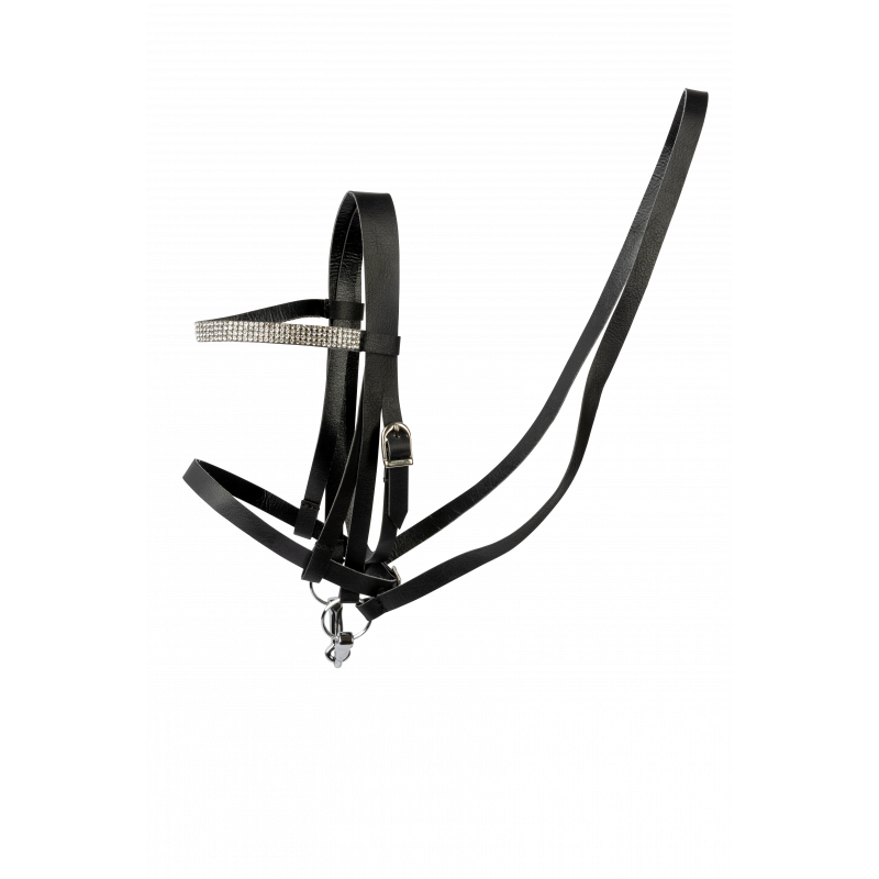 Ett fint litet träns i svart konstläder med många detaljer som pannband med kristaller och ett litet bett.