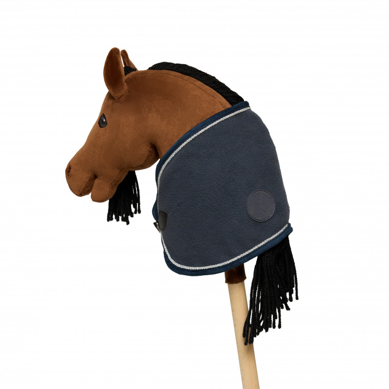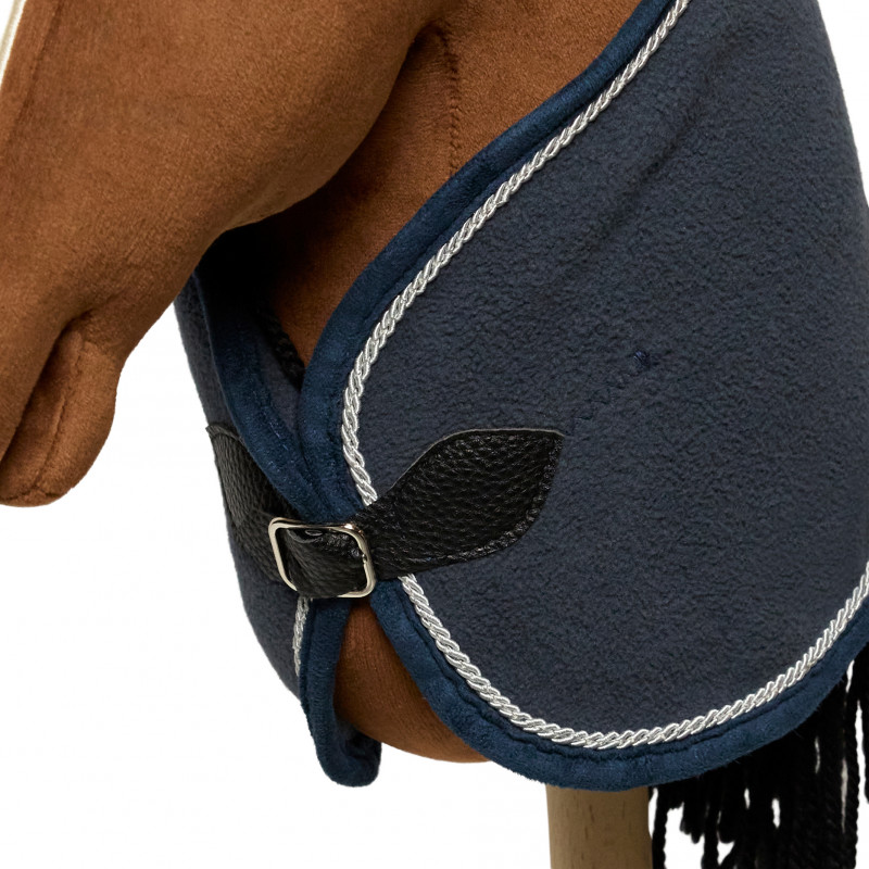 Ett extra fint täcke som passar till Cheval Roi´s käpphästar. Täcket är av tyg och har ett påsytt band i silver och sitter fint på hästen med ett spänne. Precis som ett riktigt tävlingstäcke!
