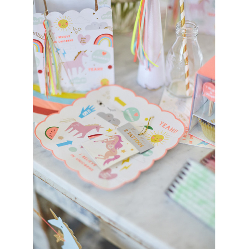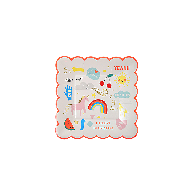 Söta engångstallrikar med enhörningar och festligt tryck som passar perfekt till festen med enhörnings-tema! Engångstallrikarna har en vit botten, en klar, korallrosa kant formad i volang och ett färgglatt mönster som ger det där lilla extra. Tallrikarna passar perfekt till födelsedagskalaset, middagen med kompisarna, baby showers, picknick och eller till andra festliga tillfällen!