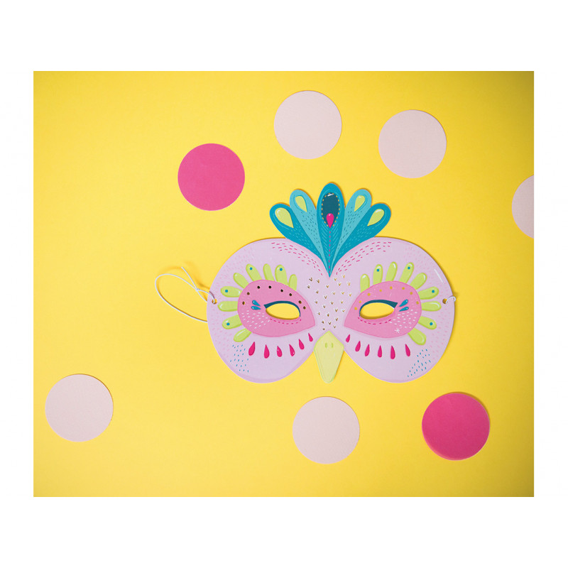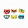 Sex fina djurmasker i papper i en klar påse. Maskerna är fantasifullt dekorerade i härliga färger och mönster: två björnar, räv, gepard, apa och uggla - perfekt till kalaset eller maskeraden.