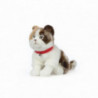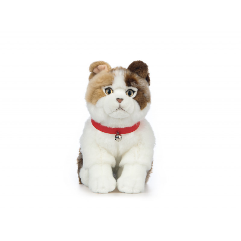 Denna söta Scottish fold-katt har ett runt ansikte med nedvikta öron, runda bärnstens-gula ögon och vit päls med stora spräckliga fläckar i olika bruna nyanser.  Den har också naturtrogna detaljer, ett rött halsband med en söt bjällra på och riktigt gosig päls som lockar till mysstunder tillsammans.  Denna gulliga katt älskar att hänga med dig överallt och ge dig sitt stöd och sin kärlek.  Bör ej lämnas utan uppsikt i sängen hos små bebisar. .   Storlek: ca H22 x B14 x D40 cm