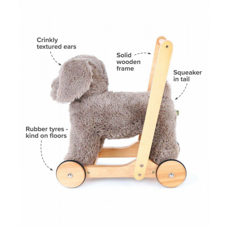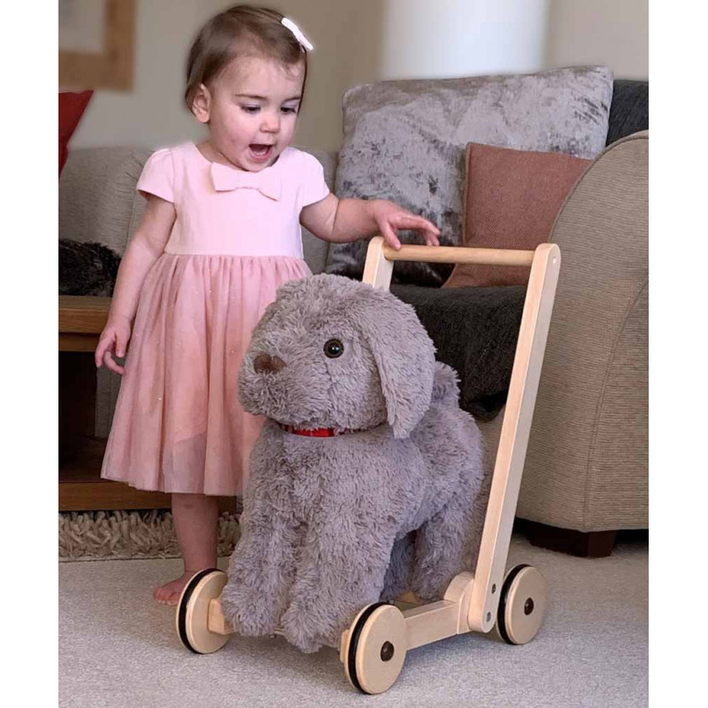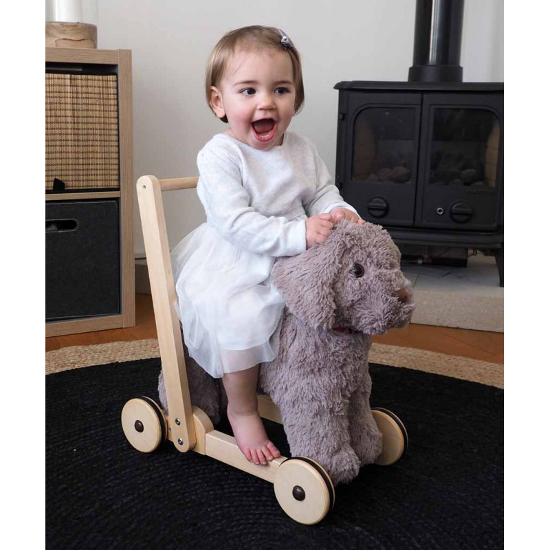 Vill man hellre ta en åktur är det bara att hoppa upp på hans rygg! Trähjulen har gummidäck för ett bra och säkert grepp på alla typer av golv.