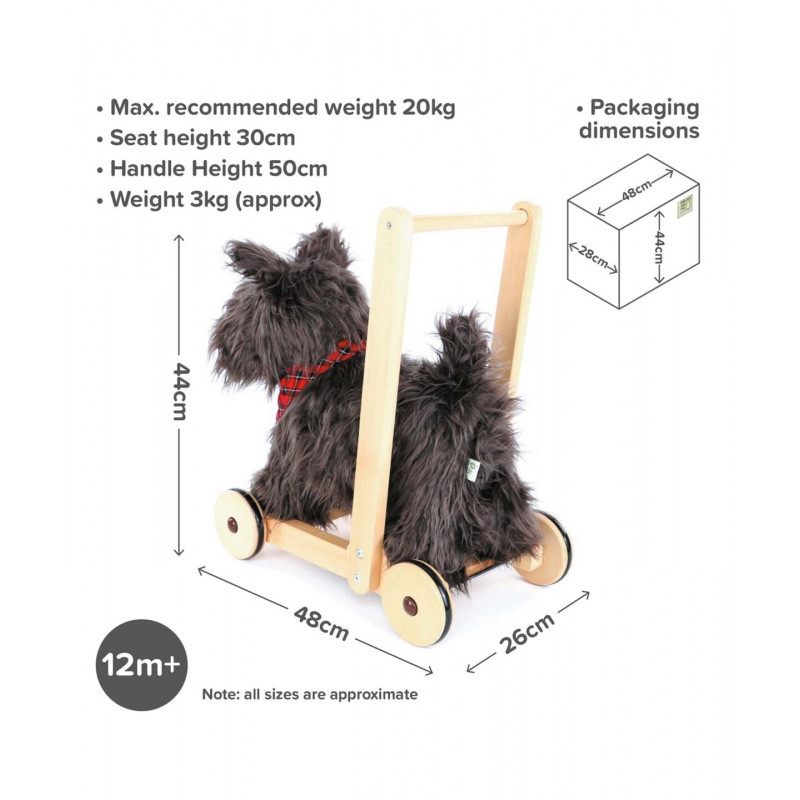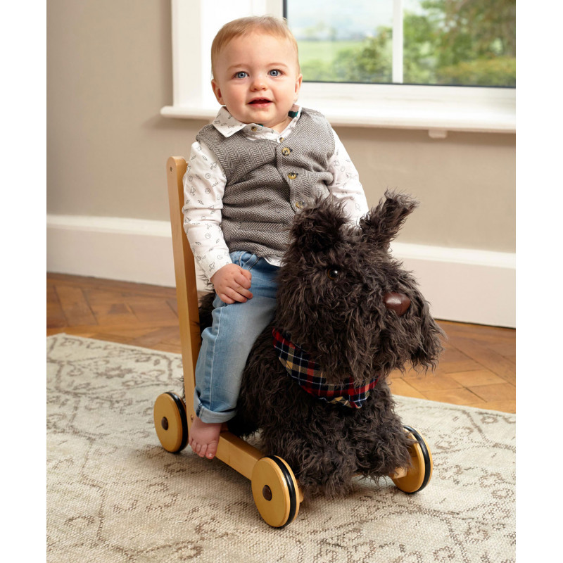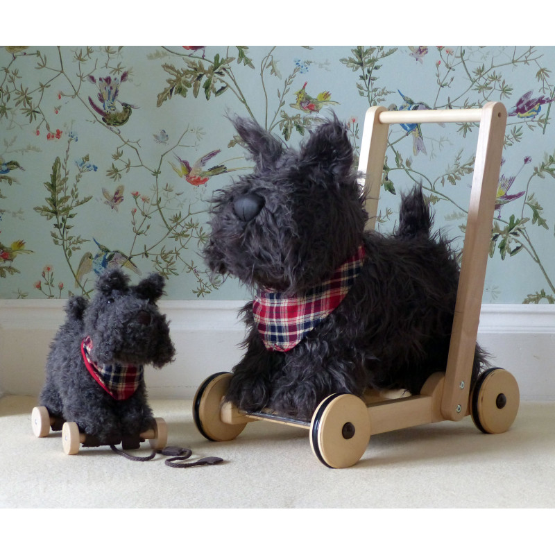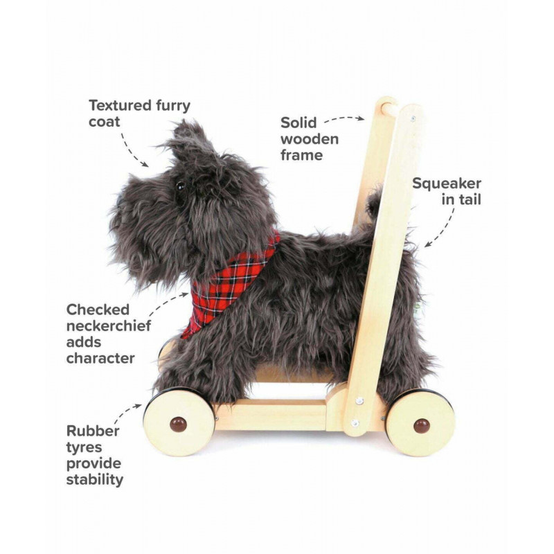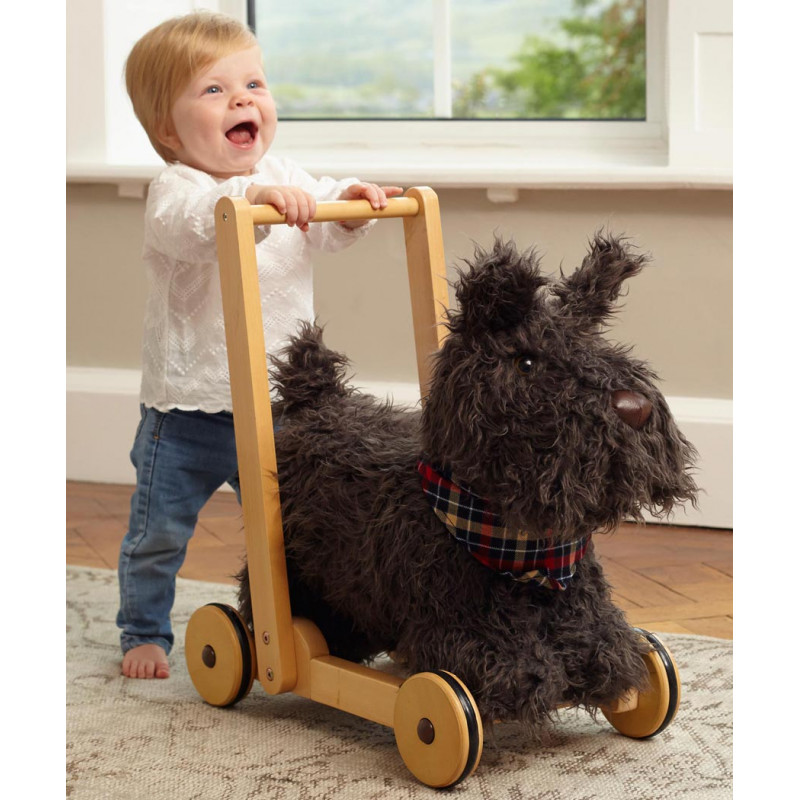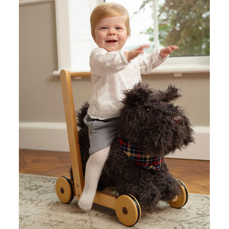 Hunden Scottie blir det perfekta stödet när ditt barn lär sig gå! Med sin supermjuka svartlockiga päls och gulliga nos blir han en kär vän i barnrummet.