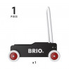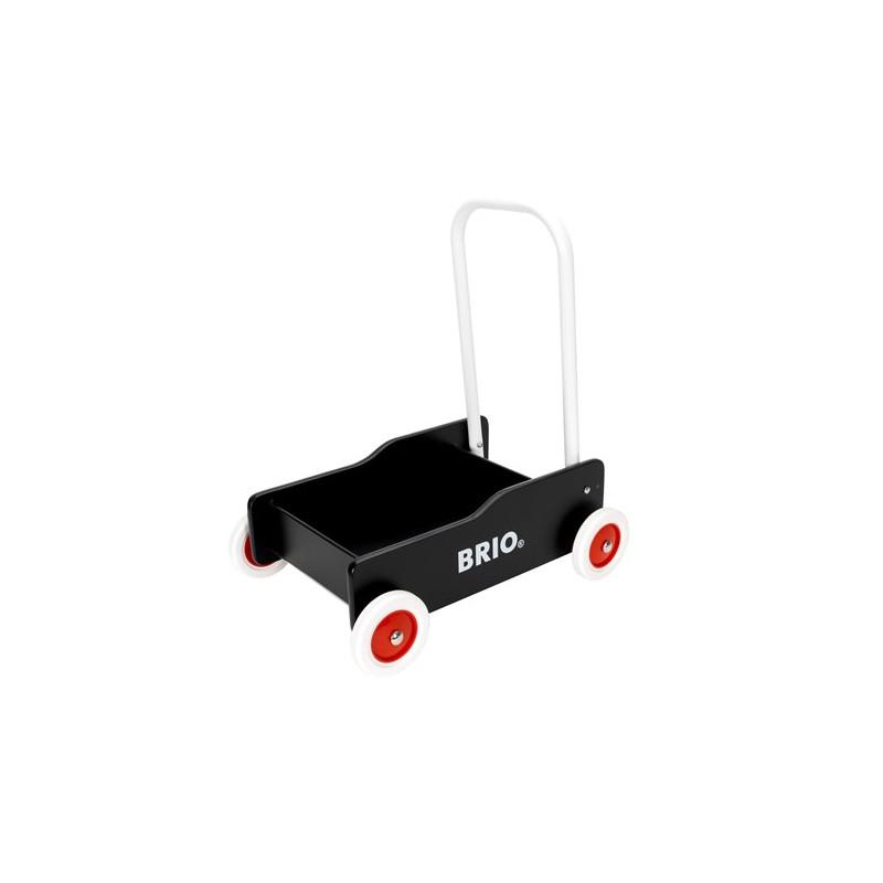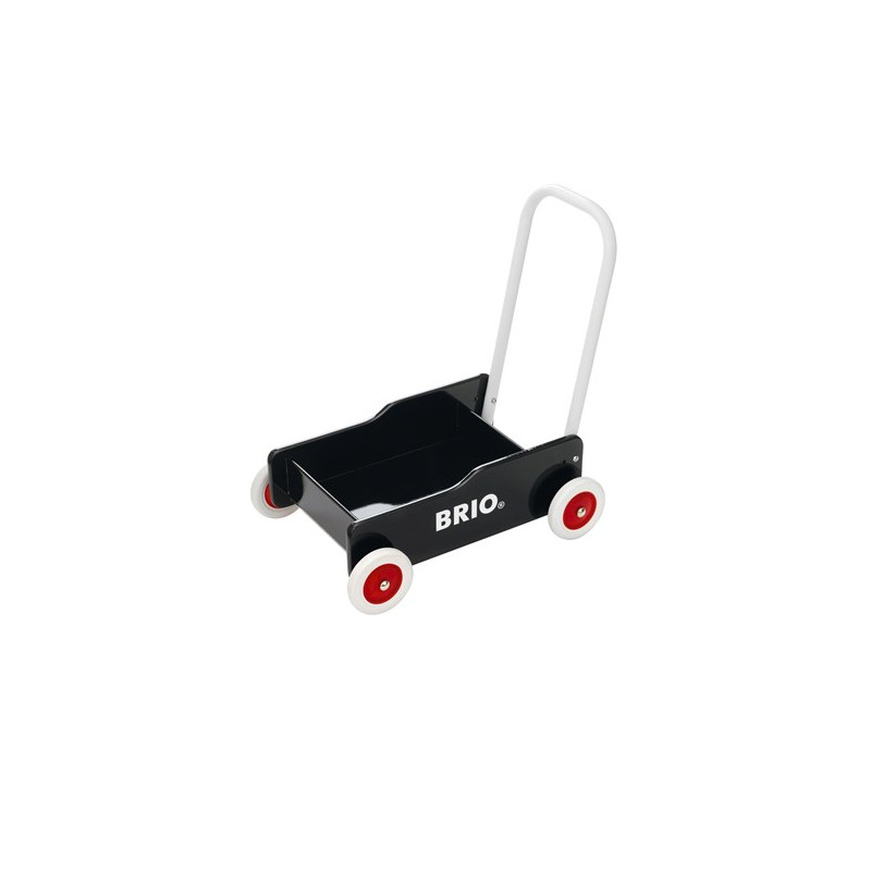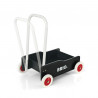 Med justerbart handtag och broms kan leksaken anpassas efter hur barnet använder vagnen. Vagn i trä och handtag i metall.