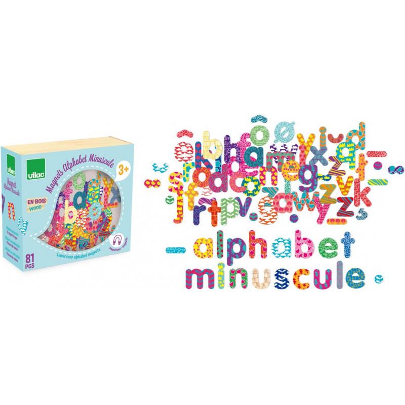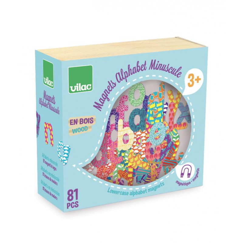 Små bokstäver i trä med alfabetmagneter från VILAC. Innehåller 81 delar inklusive symboler, accenter och skiljetecken. Trälådan mäter 15 x 14 x 6 cm. Säkerhetsbetyg för åldrar från 3 år och uppåt.