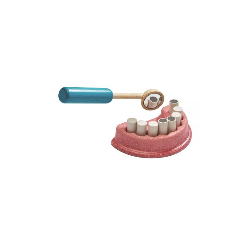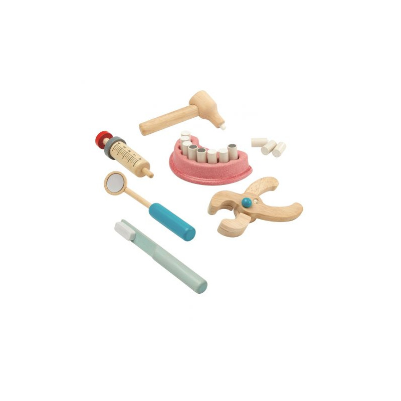 Allt för tandläkaren. Undersök, borsta eller dra ut tänder. Diverse verktyg så som tång, spegel, bedövningsspruta och tandborste, allt samlat i ett bälte. En ekologisk och giftfri träleksak från PlanToys.