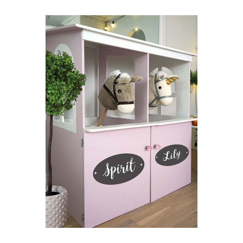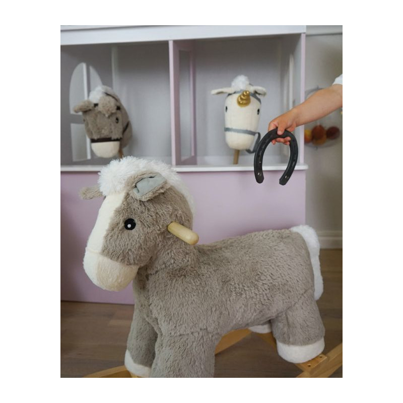 Söt käpphäst i grått och vitt med tillhörande träns. Bygg upp en hinderbana och tävla med din vänner och se vem som hoppar högst och vem som kommer först i mål. Eller varför inte bara rida ut i skogen med din nya följeslagare och bästa vän.