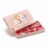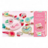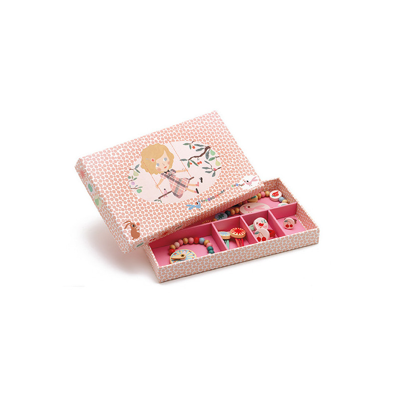 Fint smyckeset i fina pastellfärger. Smyckena är färdiga att användas och är tillverkade av trä, metall och elastiska snoddar. Setet innehåller ett elastiskt halsband, ett elastiskt armband med urtavla, en justerbar ring, två hårsnoddar och två hårspännen. Allt kommer i en fin låda att förvara delarna i. Från 3 år