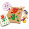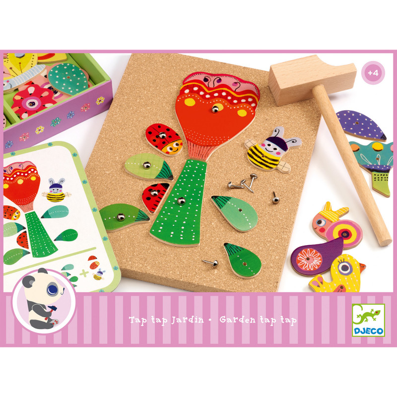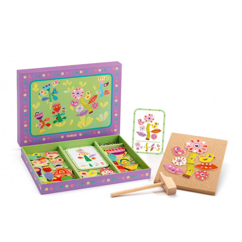 Ett klassiskt nöje i form av ett korkunderlag, en hammare i trä, spikar med stora huvuden och färggranna motivplattor i trä med hål för spikarna. Allt material är samlat i en låda av trä. Skapa dina gena trädgårdsmotiv eller följ något av ritningskorten som medföljer. Många timmars nöje finns att få. Från 4 år
