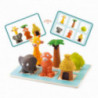 Pedagogiskt och trevligt spel där barnen får lära sig om fenomenen framför och bakom. I spelet finns 20 olika kort med bilder på hur en uppställning av figurerna ser ut framifrån. Målet är att man ska ställa upp alla figurerna på de nedsänkta rutorna på spelplanen så att det ser likadant ut som på bilden - är giraffen framför eller bakom elefanten och var ska palmen vara? På baksidan av varje kort finns facit som visar hur man ska ställa upp pjäserna för att det ska bli rätt. Förpackningen innehåller: en spelplan i trä, 6 figurer och 20 kort med utmaningar. Från 4 till 6 år.