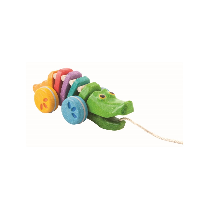 En färgglad och rolig dragdjur i form av en alligator i regnbågens färger. Huvud och svans rör sig upp och ner och ger ett klapprande ljud.
