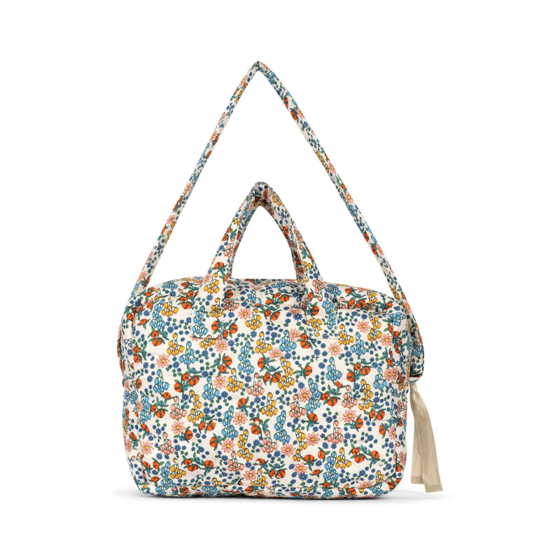 Fin och praktisk skötväska till dockans alla saker! Söt med blommor och fjärilar som motiv. Väskan stängs med blixtlås och har en stor ficka på utsidan. Justerbar axelrem som gör att den passar alla.