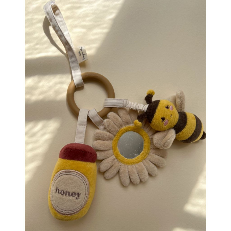 En rolig aktivitetsleksak med många olika strukturer och färger att utforska. En stimulerande leksak för barnets sinnen med fina figurer fastsatta i en silikonring. En ring är strukturerad och en rem är elastisk, så att bebisen kan utveckla sina taktila sinnen. en figur innehåller en plastspegel och de två figurerna har ett svagt ringande ljud.