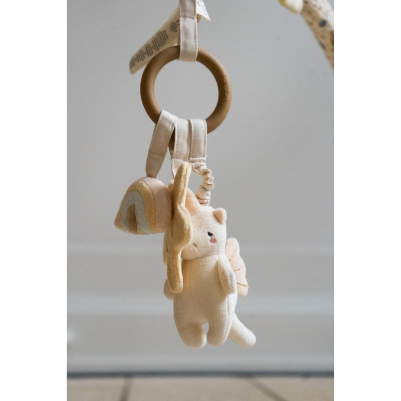 En rolig aktivitetsleksak med många olika strukturer och färger att utforska. En stimulerande leksak för barnets sinnen med fina figurer fastsatta i en silikonring. En ring är strukturerad och en rem är elastisk, så att bebisen kan utveckla sina taktila sinnen. en figur innehåller en plastspegel och de två figurerna har ett svagt ringande ljud.