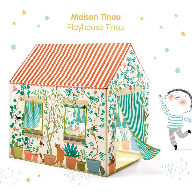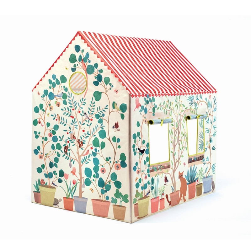 Ett härligt, rymligt och somrigt lektält att använda inomhus. Med fina motiv av krukväxter och djur runt hela tältet och många snygga detaljer att upptäcka. Alla 3 fönster och dörren har gardiner som går att rulla upp och knyta fast för att hålla dem öppna. Tillverkat av Non-woven tyg (fibertyg) i polyester med monterbar ram samt förstärkningar i plast. Enkelt att montera och kompakt förvaring.