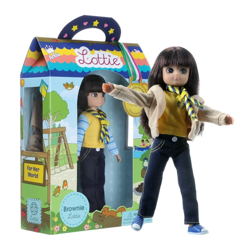Lottie har gått med i scouterna och ser mycket fram emot utflykter och sommarlägret med sina vänner. Denna fina docka har långt mörkbrunt hår, solbränd hud och bruna ögon. Den 18 cm höga dockan kommer med: en långärmad tröja i gult och blått, en blå-gul scout-halsduk, mörka jeans, blå-vita skor och en beige luvtröja för kalla kvällar. Dockan kan stå av sig själv, och utformades utifrån proportionerna på 9-åriga tjejer. Armar och ben kan vridas och riktas som man vill, och knäna går att böja försiktigt till tre olika positioner. Kläderna går att ta av och passar till alla andra dockor i Lottie-serien.