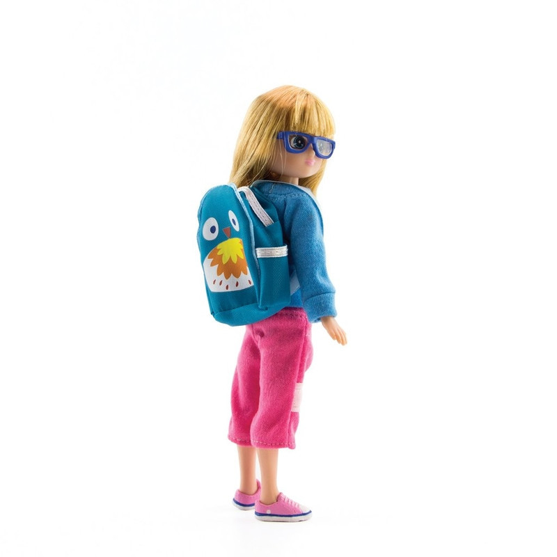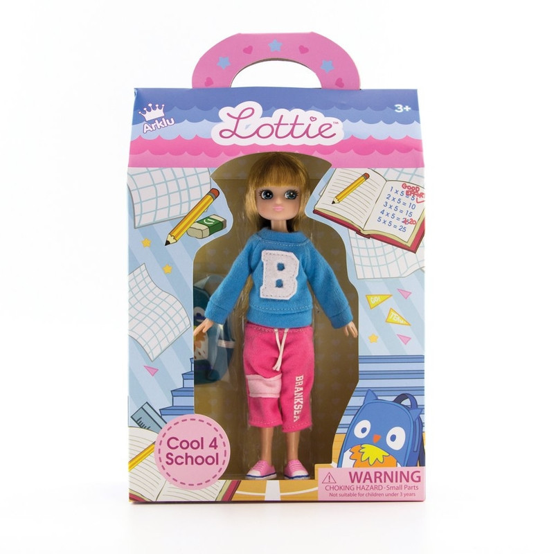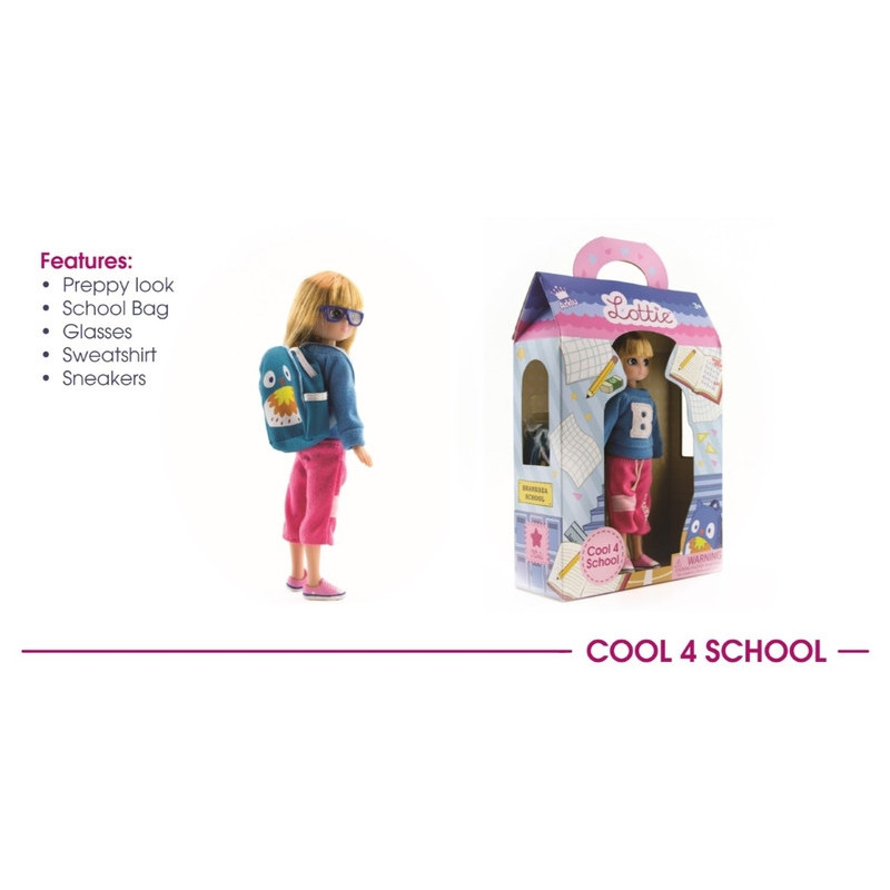 Härlig och cool docka som är redo för skolans första dag. Hon ser fram emot att få visa upp sin nya roliga ryggsäck och coola kläder för en dag i skolan. Setet innehåller: en mellanblond docka med blå ögon och solbränd hud, en ljusblå sweatshirt, långa rosa shorts med sportiga detaljer i vitt, rosa skor, en blå ryggsäck formad som en uggla och blåa glasögon. Dockan är 18 cm hög, kan stå av sig själv och utformades utifrån proportionerna på 9-åriga tjejer. Armar och ben kan vridas och riktas som man vill, och knäna går att böja försiktigt till tre olika positioner. Kläderna går att ta av och passar till alla andra dockor i Lottie-serien.