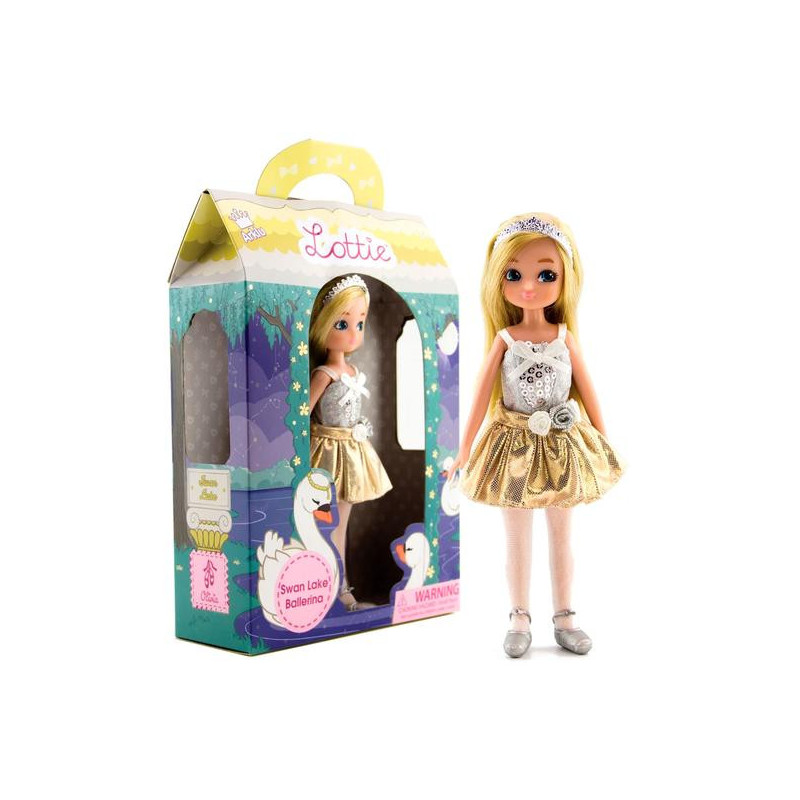 Lottie älskar att dansa balett och nu får hon vara med på säsongens stora uppsättning av Svansjön! Därför har hon nu fått extra fina balettkläder i silver och guld med paljetter, rosor och rosetter som dekoration, nästan genomskinliga vita strumpbyxor, balettskor i silver och en vacker och gnistrande tiara för speciella uppträdanden. Denna Lottie har blå ögon, ljust skinn och långt blont hår som går att sätta upp i snygga frisyrer. Den 18 cm höga dockan kan stå av sig själv, och utformades utifrån proportionerna på 9-åriga tjejer. Armar och ben kan vridas och riktas som man vill, och knäna går att böja försiktigt till tre olika positioner. Kläderna går att ta av och passar till alla andra dockor i Lottie-serien.