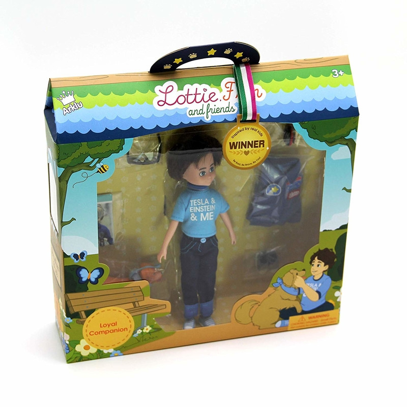 Charmig och kaxig docka för det djurälskande barnet. Dockan kommer med en härlig hundkompis och tillsammans med Lottie kan de både hjälpa till där det behövs och busa när andan faller in. Förpackningen innehåller docka, hund och diverse tillbehör. Dockan är 18 cm hög, kan stå av sig själv och utformades utifrån proportionerna på 9-åriga killar. Armar och ben kan vridas och riktas som man vill, och knäna går att böja försiktigt till tre olika positioner. Kläderna går att ta av och passar till alla andra dockor i Lottie-serien.
