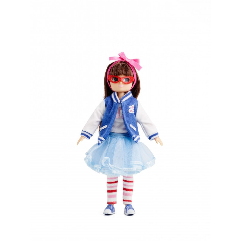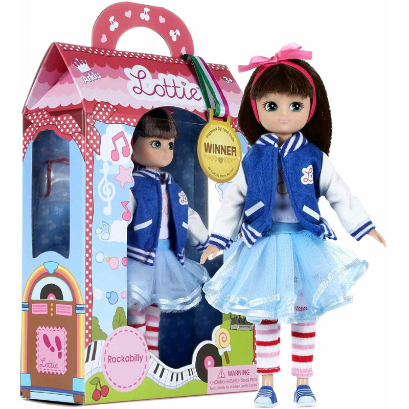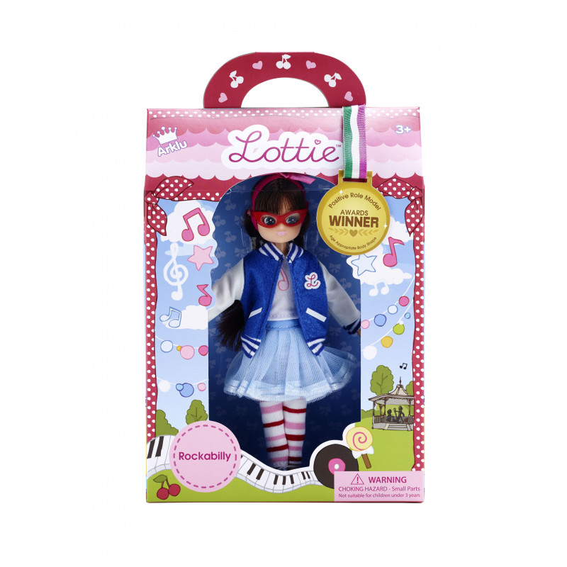 Klädd i sina favoritkläder och vintage glasögon beger sig Lottie till folkparken för att lyssna på live-musik och dansa. Det är kul att upptäcka ny musik, släppa loss och bara vara sig själv oavsett vad andra tycker. Dockan är 18 cm hög, har mörkbrunt hår, blå-grå ögon och kommer med: 1 blå-vit college-jacka i vintage stil, 1 sött hårband med rosa rosett, 1 långärmad tröja, 1 ljusblå tyllkjol, 1 par randiga leggings, blå-vita tennisskor och ett par röda glasögon i vintage stil. Dockan kan stå av sig själv, och utformades utifrån proportionerna på 9-åriga tjejer. Armar och ben kan vridas och riktas som man vill, och knäna går att böja försiktigt till tre olika positioner. Kläderna går att ta av och passar till alla andra dockor i Lottie-serien.