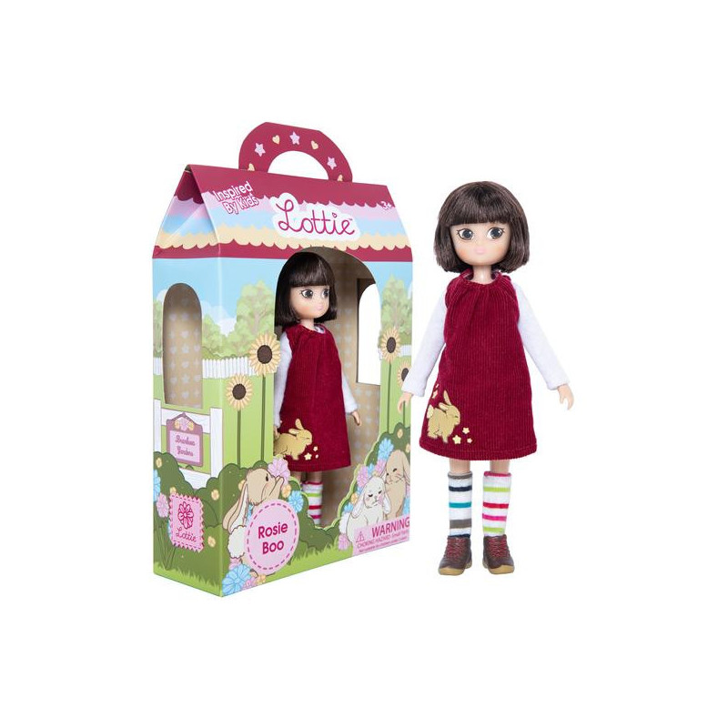 En söt Lottie-docka som baseras på Rosie Boo, en sprudlande tjej med Downs syndrom som älskar djur och natur. En del av priset för varje sold docka doneras till Rosies valda välgörenhetsförening, Andovertwenty1.org.uk , som stöttar barn med Downs syndrom och deras familjer inom en radie av 40 km av staden Andover. Dockan kommer med en manchester-klänning dekorerad med en söt kanin som representerar Rosie Boos kärlek till djur och natur, udda strumpor och kängor med extra stöd för att hjälpa henne gå. De udda strumporna är en internationell symbol för att fira den internationella Downs syndrom-dagen 21/3 då man visar att man står upp för och hyllar olikheter. Denna Lottie har bruna ögon, ljust färgad hud och axellångt brunt hår av högkvalitativt nylon som inte trasslar ihop sig lika lätt och som går att sätta upp i olika frisyrer. Dockan är 18 cm hög, kan stå av sig själv och utformades utifrån proportionerna på 9-åriga tjejer. Armar och ben kan vridas och riktas som man vill, och knäna går att böja försiktigt till tre olika positioner. Dockan är tillverkad av ftalatfri vinylplast som känns mjuk att röra vid, och kläderna går att ta av samt passar till alla andra dockor i Lottie-serien. Från +3 år.