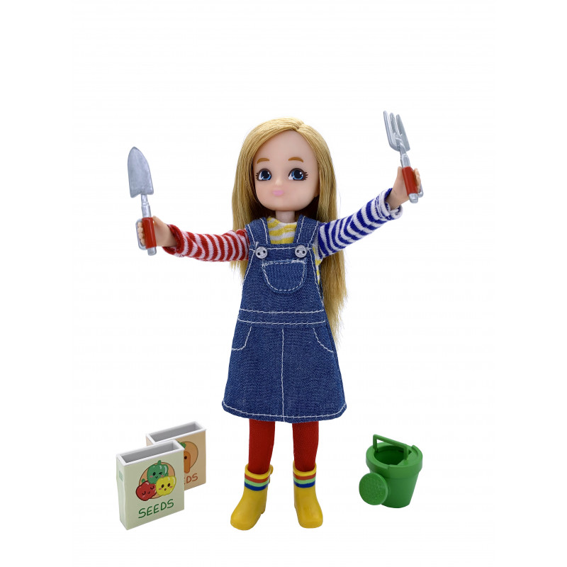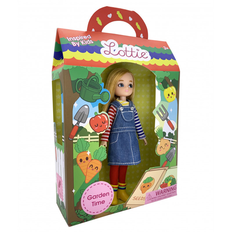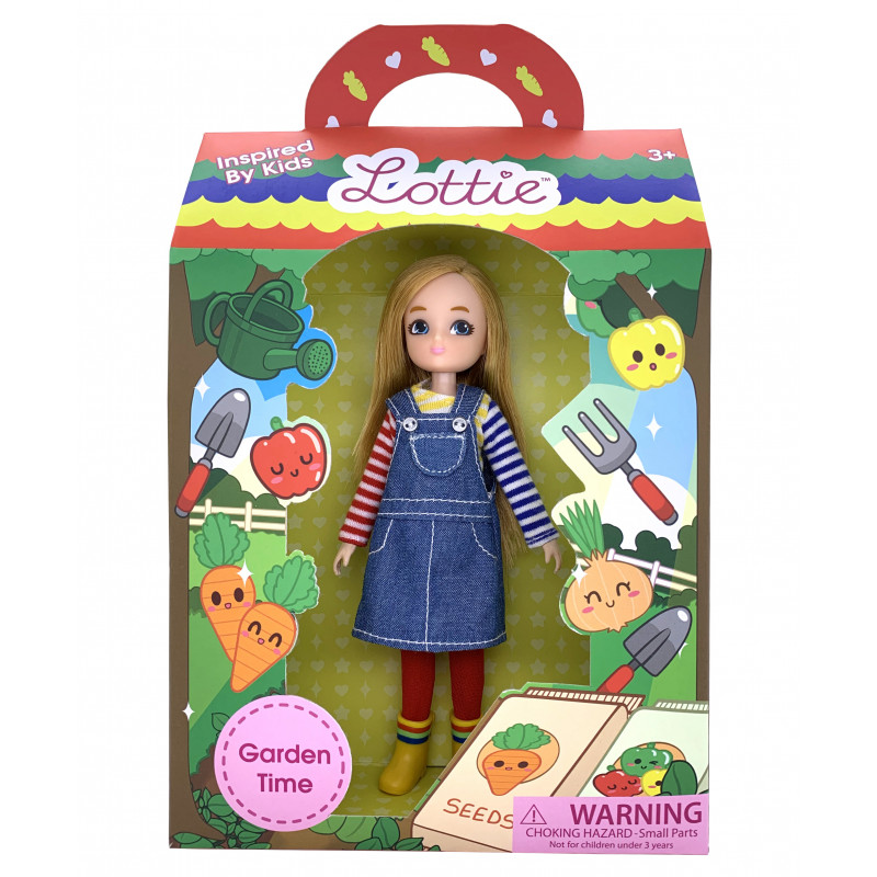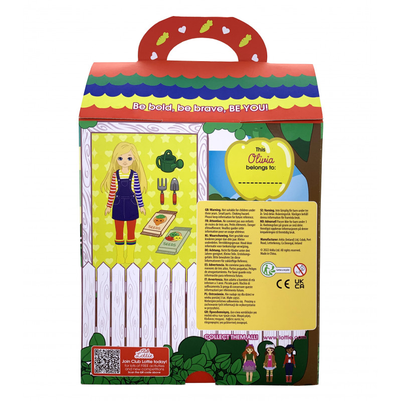 Dockan Olivia älskar att vara i trädgården och när det är dags att så börjar hennes gröna fingrar verkligen längta efter att stoppa frön i jorden och hjälpa dem att växa sig stora och starka. I år ser hon till att det blir riktigt närodlade grönsaker att hämta senare i år genom att så både morötter och paprikor i kökslandet. Denna Lottie docka har långt, rakt blont hår med sidbena, ljusblå ögon och är ljushyad. Dockan kommer med en långärmad tröja med ränder i rött, gult eller blått på vit botten, en hängselkjol i denim, röda tights, gula stövlar med färgglada ränder på skaften, två sött designade förpackningar med frön, en liten planteringsspade, en liten räfsa eller kultivator samt en liten grön vattenkanna. Dockan är 18 cm hög, kan stå av sig själv och utformades utifrån proportionerna på 9-åriga tjejer. Armar och ben kan vridas och riktas som man vill, och knäna går att böja försiktigt till tre olika positioner. Håret går att borsta och sätta upp i olika frisyrer och kläderna går att ta av och passar till alla andra dockor i Lottie-serien. Från +3 år.