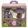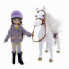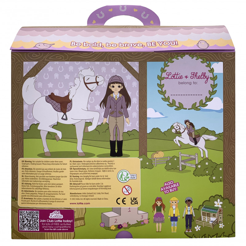 Dockan Lottie och hennes vackra ponny Shelby älskar att spendera tid tillsammans, oavsett om det är en spännande hopptävling eller en avkopplande badtur på sommaren. Nu har de förberett sig på en viktig tävling och Lottie har skaffat matchande utstyrslar i hennes favoritfärg lila. Denna Lottie docka har långt, rakt mörkbrunt hår med lugg, ljusbruna ögon och en lätt solbränna medan hennes ponny är en helt vit skimmel med silkeslen man och svans och mörkblå ögon. Dockan kommer med en vitskjorta, gul slips, lila ridjacka i fiskbensmönster med ljusbrun krage och ficklock samt guldiga knappar, beige ridbyxor med lila detaljer, en sammetslen ljuslila ridhjälm och svarta ridstövlar medan hästen kommer med ett ett ljusbrunt betsel, en ljusbrun sadel med stigbyglar och ett elegant lila schabrak. Dockan är 18 cm hög, kan stå av sig själv och utformades utifrån proportionerna på 9-åriga tjejer. Armar och ben kan vridas och riktas som man vill, och knäna går att böja försiktigt till tre olika positioner. Dockans hår och hästens man samt svans går att borsta samt sätta upp i olika frisyrer och dockans kläder går att ta av och passar till alla andra dockor i Lottie-serien. Från +3 år.