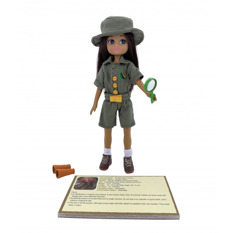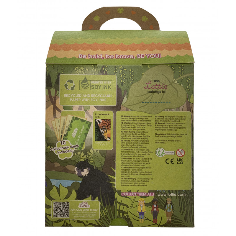 En speciell Lottie docka framtagen tillsammans med Rainforest Trust, en organisation som skyddar regnskog och andra kritiska samt nödvändiga livsmiljöer för utrotningshotade arter över hela världen. Mer än en miljon arter riskerar att utrotas under det här århundradet, ofta på grund av att deras livsmiljöer samt ekosystemen som de förlitar sig på förstörs, och regnskogen är hem till väldigt många av dem samtidigt som den är en nödvändig del i att stoppa klimatförändringarna. Den här dockan har tagit fasta på detta och engagerar sig helhjärtat i att samla in bidrag och informera om olika utrotningshotade djur samt vad du kan bidra med för att skydda dem och vår planet. Denna Lottie docka har långt, rakt mörkbrunt hår, bruna ögon och är brunhyad. Dockan är klädd i en khaki grön utstyrsel med solhatt, kort onepiece med Rainforest Trusts logga på bröstet och ett ordentligt bälte, vita strumpor samt ordentliga mörkbruna kängor som passar perfekt för att vandra omkring i regnskogen med. Dockan kommer med en kikare, ett förstoringsglas samt tio samlarkort med bilder och information på engelska om olika utrotningshotade arter. Dockan är 18 cm hög, kan stå av sig själv och utformades utifrån proportionerna på 9-åriga tjejer. Armar och ben kan vridas och riktas som man vill, och knäna går att böja försiktigt till tre olika positioner. Håret går att borsta samt sätta upp i olika frisyrer och kläderna går att ta av och passar till alla andra dockor i Lottie-serien. Från +3 år.