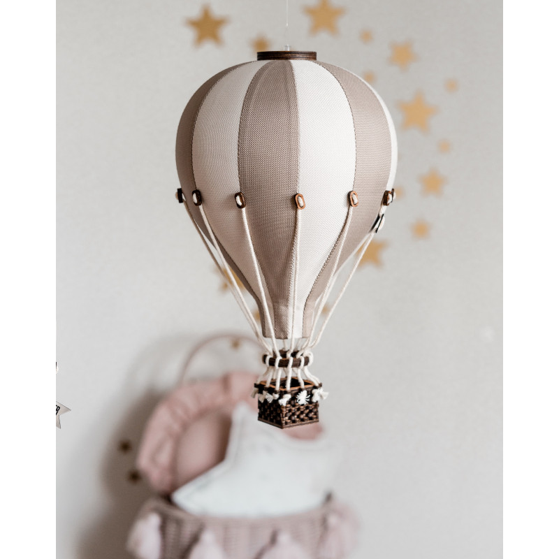 Vacker handgjord luftballong som verkligen gör det där lilla extra med inredningen. Häng den ensam eller flera stycken tillsammans. En garanterat uppskattad gåva. Ballongen är tillverkad i polyester på utsidan och en insida av latex. Fina detaljer som bomullsrep och en korg i betsat trä. Det medföljer en fiskelina att hänga ballongen i.