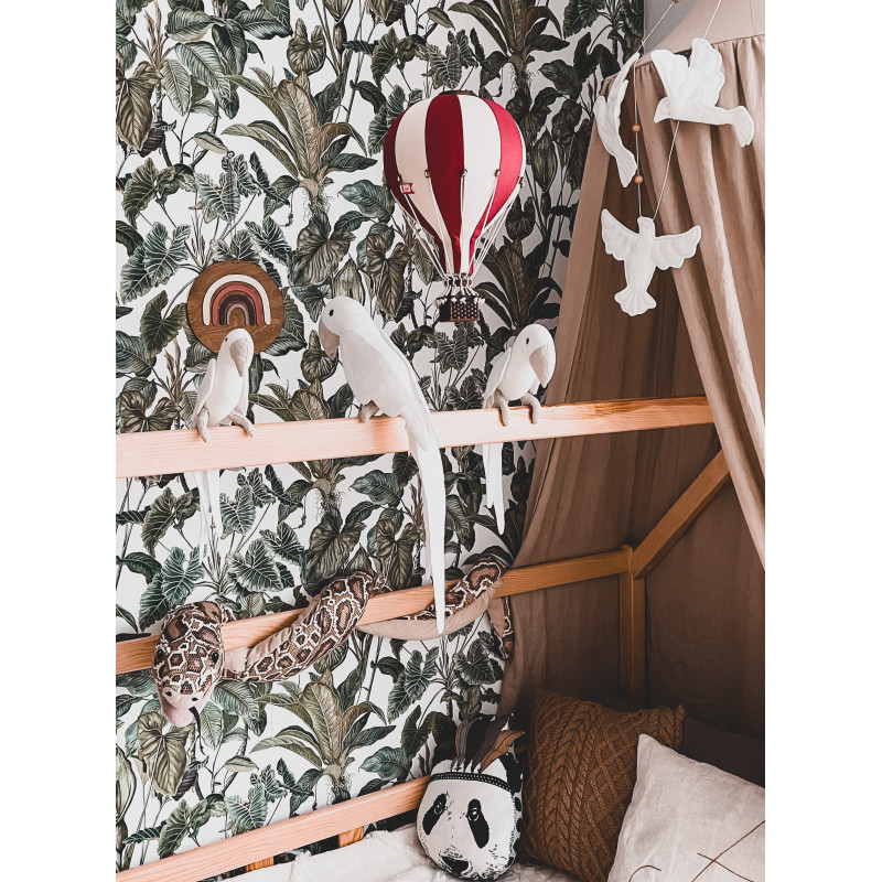Vacker handgjord luftballong som verkligen gör det där lilla extra med inredningen. Häng den ensam eller flera stycken tillsammans. En garanterat uppskattad gåva. Ballongen är tillverkad i polyester på utsidan och en insida av latex. Fina detaljer som bomullsrep och en korg i betsat trä. Det medföljer en fiskelina att hänga ballongen i.