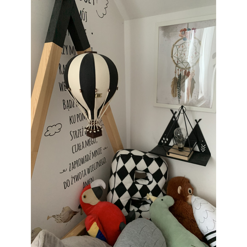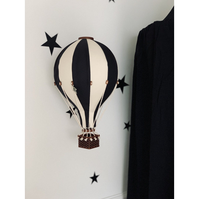 Vacker handgjord luftballong som verkligen gör det där lilla extra med inredningen. Häng den ensam eller flera stycken tillsammans. En garanterat uppskattad gåva. Ballongen är tillverkad i polyester på utsidan och en insida av latex. Fina detaljer som bomullsrep och en korg i betsat trä. Det medföljer en fiskelina att hänga ballongen i.