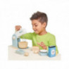En fin bakmixer i trä med metallvisp som kan höjas, sänkas och vevas upptill. Ställ in hastigheten med vridknappen på sidan. En träskål, smör, mjöl, ägg, våg och bröd i form medföljer. Både roligt och spännande att pyssla med. Ca 28x21x27 cm +3 år pga små delar Design: Tender Leaf Toys