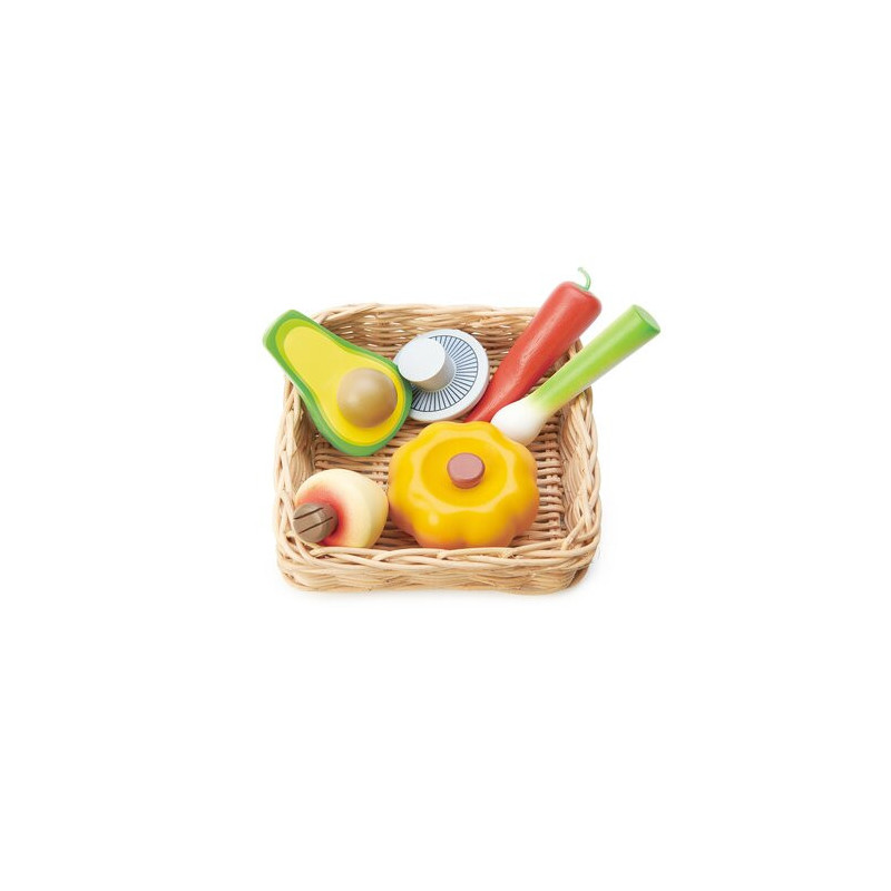 En korg full med olika grönsaker: avokado, svamp, pumpa, chili, purjolök, och palsternacka. Perfekt till leksaksköket eller till affären. Etiskt tillverkat i återvunnet gummiträ och målat med vattenbaserade färger. 15.5 x 15.5 x 5.5 cm Design av TENDER LEAF TOYS +3 år pga små delar Design: Tender Leaf Toys