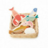 En korg full med olika fiskar och skaldjur: hummer, fyra fiskar, räka och mussla. Perfekt till leksaksköket eller till affären. Etiskt tillverkat i återvunnet gummiträ och målat med vattenbaserade färger. 15.5 x 15.5 x 5.5 cm Design av TENDER LEAF TOYS +3 år pga små delar Design: Tender Leaf Toys