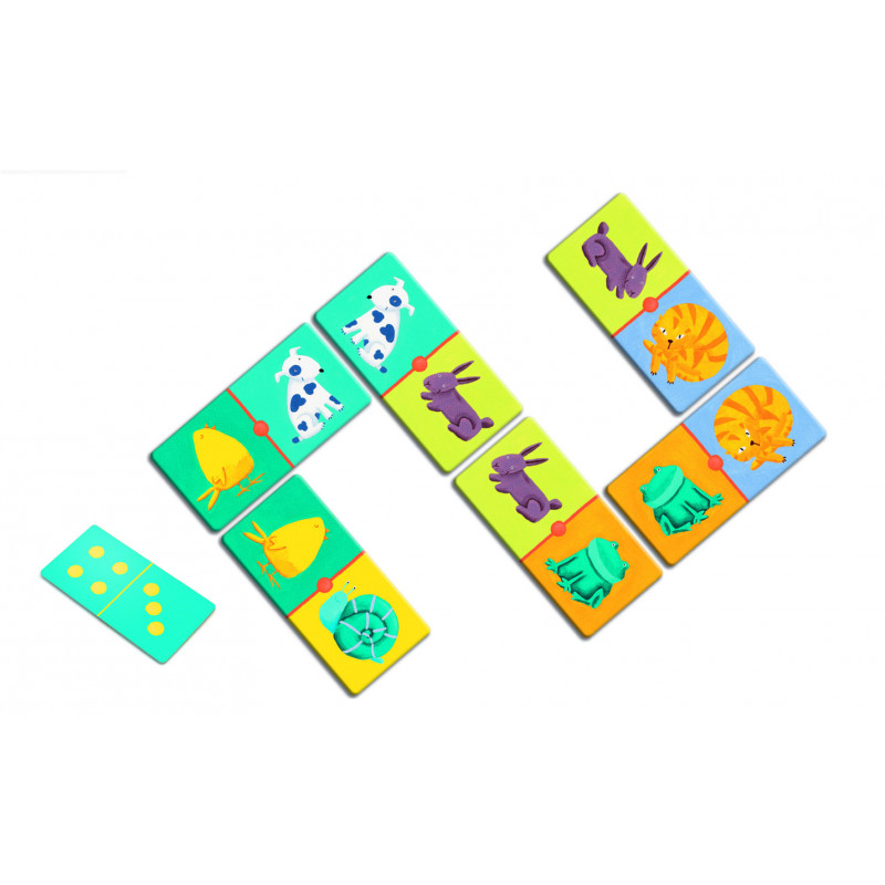 Ett fint dominospel med fina djur med olika snygga bakgrundsfärger på den ena sidan. På den andra sidan finns det de traditionella siffrorna med prickar. Man kan alltså välja om man vill spela med djuren eller med siffrorna. Bilderna är fint illustrerade. Innehåller 28 bitar i storlek 13 x 6,5 cm. Från 3 år.