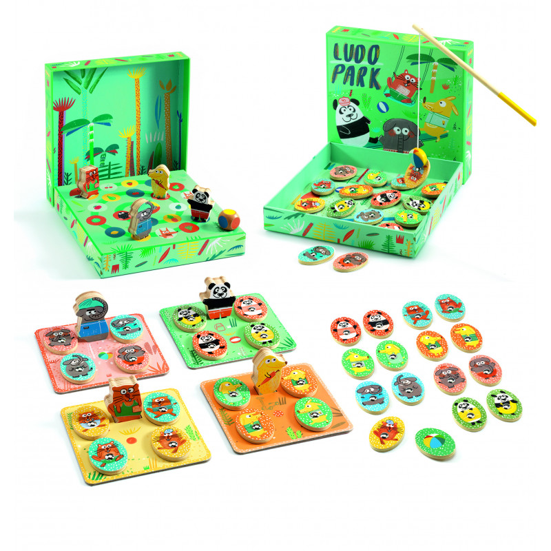 En härlig uppsättning med fyra spel för yngre barn: ett magnetiskt fiskespel, ett memory spel, ett bingo spel och ett brädspel med tärning och förflyttning. LudoPark är den perfekta uppsättningen för att introducera barn till fyra klassiska spel, uppdaterade av Djeco och speciellt designade för barn över två års ålder. För att spara utrymme är de flesta delarna designade för att användas i mer än ett av spelen, och detta gör att setet kan förvaras i en liten, lättburen låda som är lätt att ta med sig. Innehåll: 1 magnetiskt fiskespö, 16 bitar av trä och metall (används som fiskar, memory kort och bingo polletter), 4 bingokort, 4 djur-spelpjäser, 1 tärning av trä med färger istället för siffror, 1 förvarings kartong som har brädspelet på baksidan samt 1 häfte med spelregler på tio språk för alla fyra spelen.