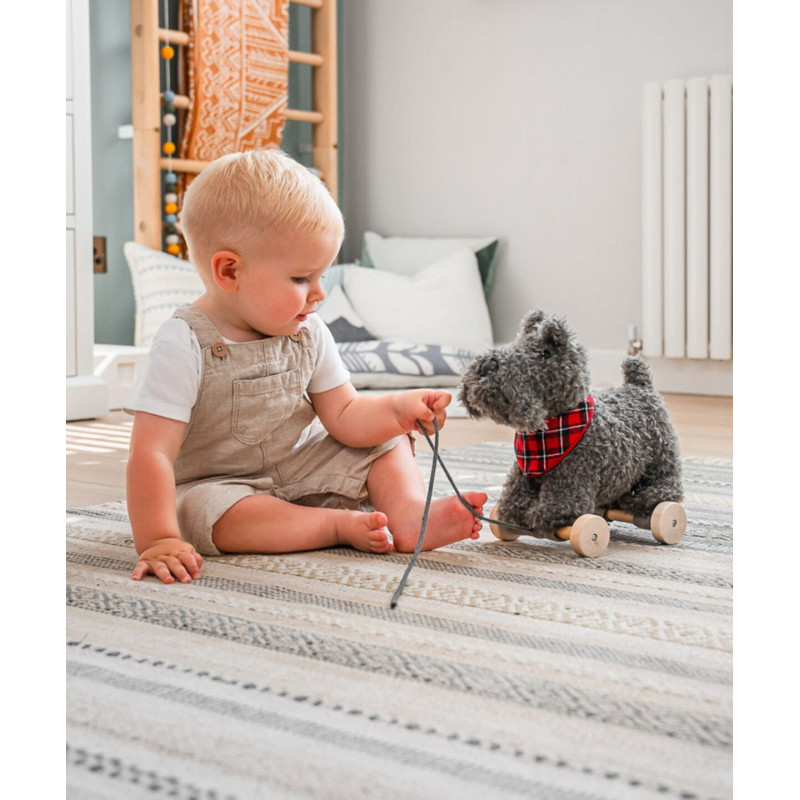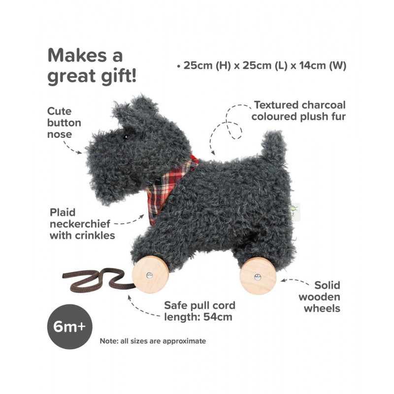 Hunden Scottie är både ett dragdjur och en kramvänlig vän. Han har en kolsvart päls och en skotskrutig scarf.