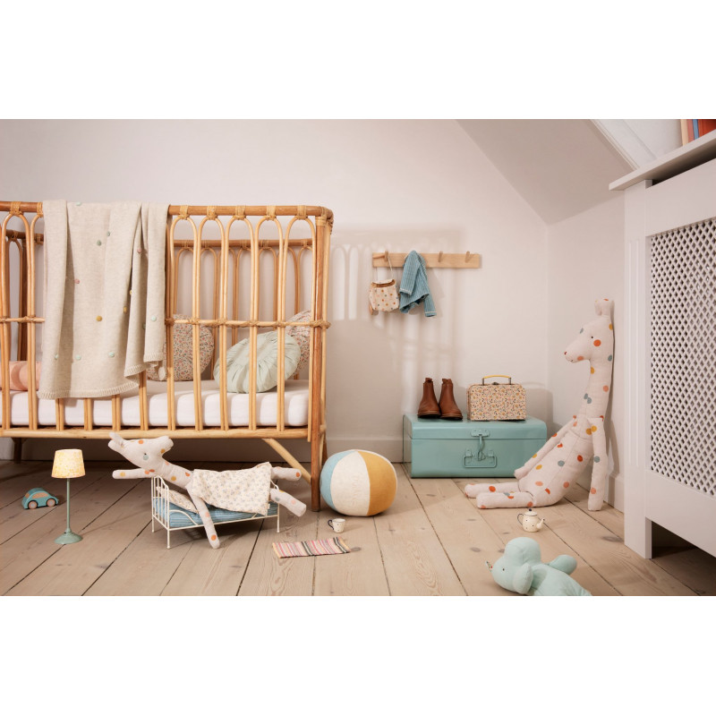 Den här charmiga giraffen blir snnabbt en kär vän. Sydd i prickigt linnetyg stoppad med återvunnen polyester, i baken finns små kulor för att giraffen skall få lite extra tyngd.