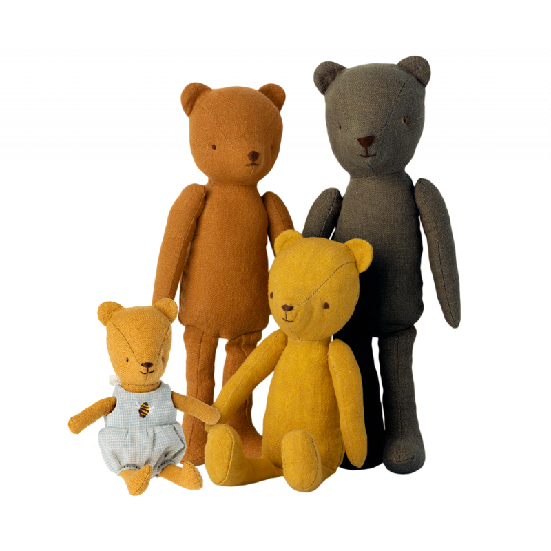 Teddy bear-familjen är en söt kollektion av nallar i fyra olika storlekar. De är tillverkade av mjukt linne och har en vintage-look.