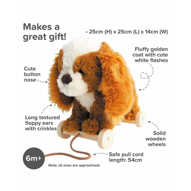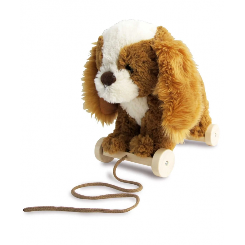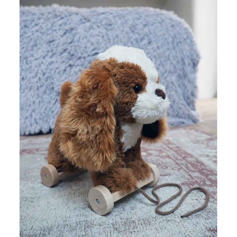 Trähjulen är fästa med kardborrband under tassarna och tas enkelt av och på. Snöret att dra med är fäst på de främre hjulparet.