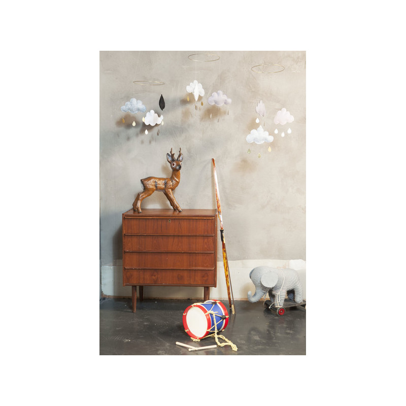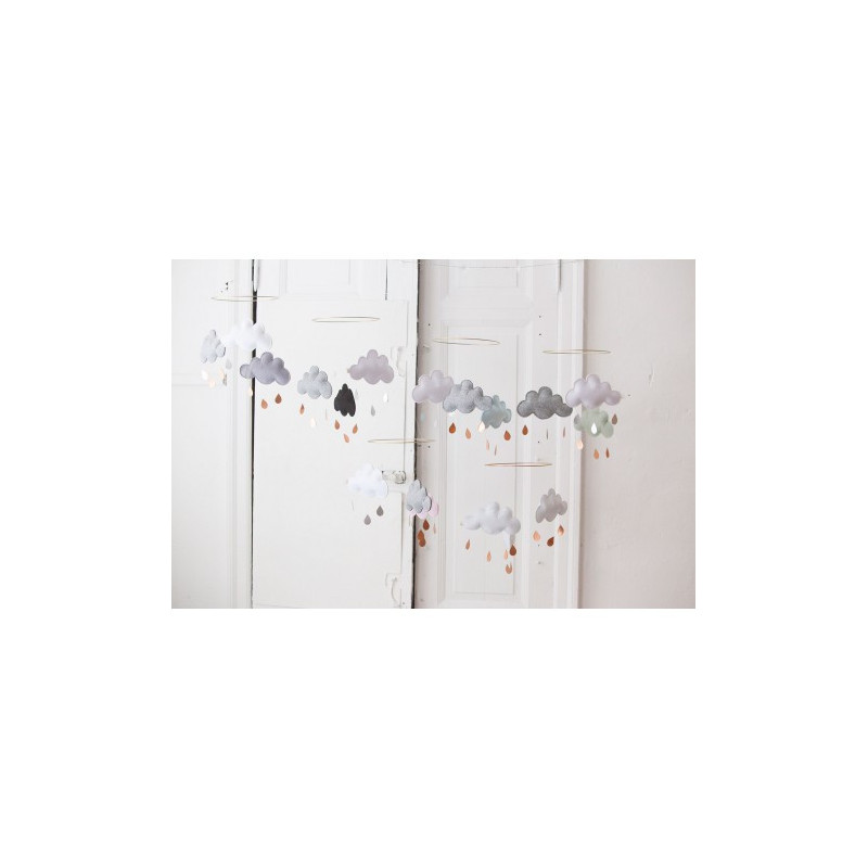 Underbar mobil i form av tre moln med hängande guld och silver droppar under. Metallringens diameter är 24,5 cm och varje moln är ca 12 cm breda. Mobilen är gjord av filt.