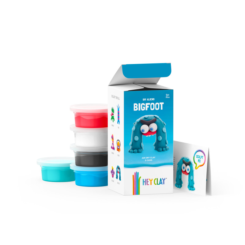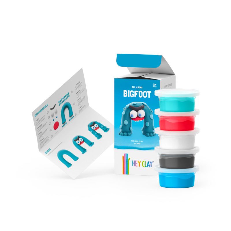 Innehåll: 5 burkar lufttorkande lera (totalt ca 75 g lera i 5 färger) samt ett informationsblad med bilder på utomjordingen, de olika stegen som krävs för att skulptera den, en länk till där ni kan hämta appen och koden som låser upp appens guide för hur man skapar Bigfoot.
