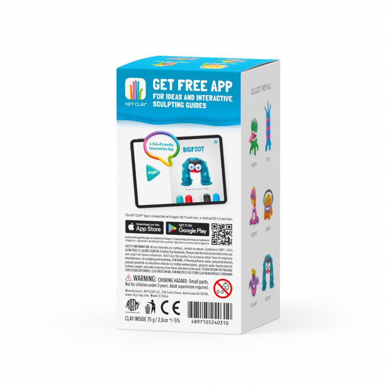 Ett riktigt kul och kreativt set med lufttorkande lera för att skapa den roliga utomjordingen Bigfoot av, som du sen kan leka med eller dela bilder av med dina vänner. Detta set innehåller 5 burkar lätt, mjuk, elastisk och färggrann lera som kan ta form med hjälp av en gratis barnvänlig app med interaktiva video-guider som har enkla steg-för-steg instruktioner (på engelska) för hur man skulpterar olika karaktärer. Du låser upp beskrivningen för Bigfoot med en kod som finns inuti paketet. Låt dig inspireras av appen och skapa roliga karaktärer av den mjuka och färgstarka leran, låt figuren lufttorka i 24 timmar så kan du sen leka med den precis som en leksak eller dela bilder på dina skapelser med dina vänner. Guiden med steg-för-steg instruktionen visar alla grundläggande tekniker för att skulptera i lera och snart kommer barnen längta efter att skapa sina helt egna figurer. Leran är lufttorkande, klibb-fri, giftfri, innehåller inget vete och har klara, livfulla färger som går att blanda ihop. Tvätta händerna efter användning och undvik att leran får kontakt med mun, ögon, mat eller dryck, vatten, fukt samt eld.
