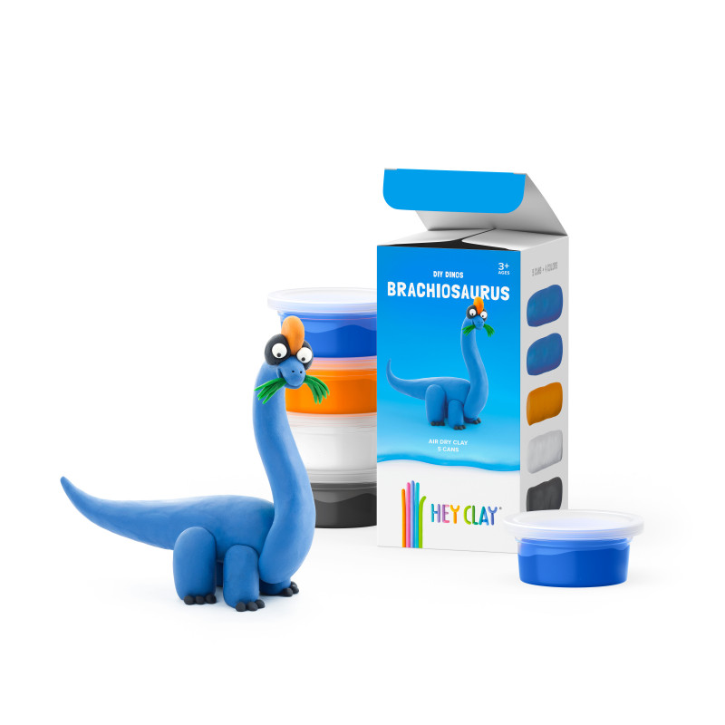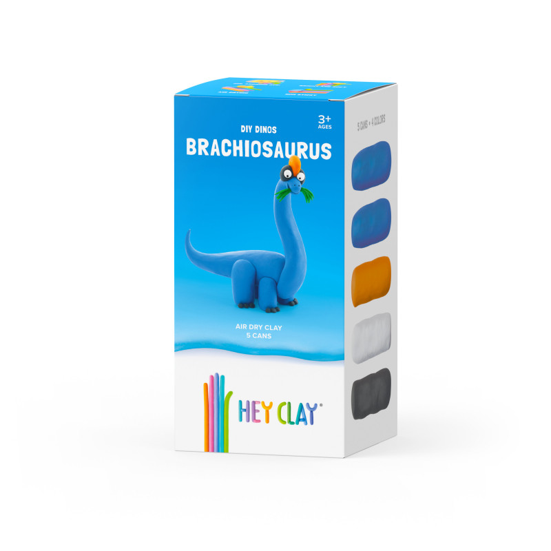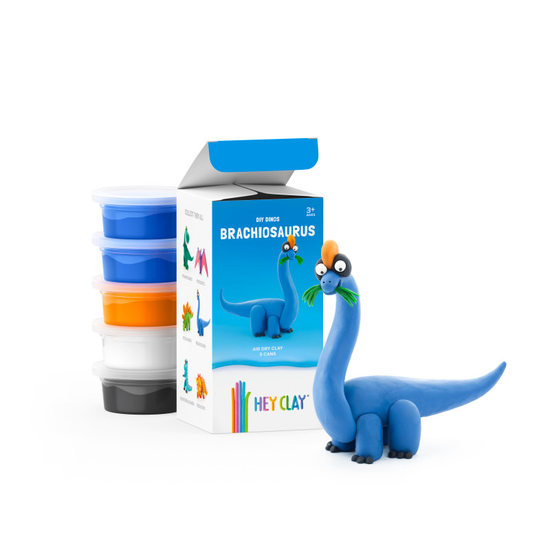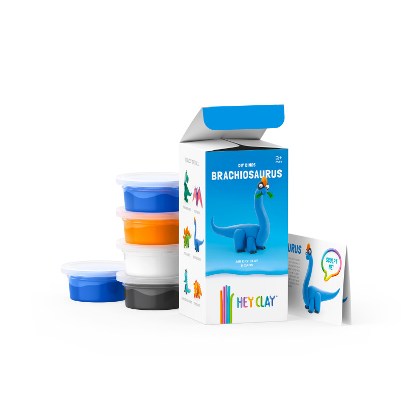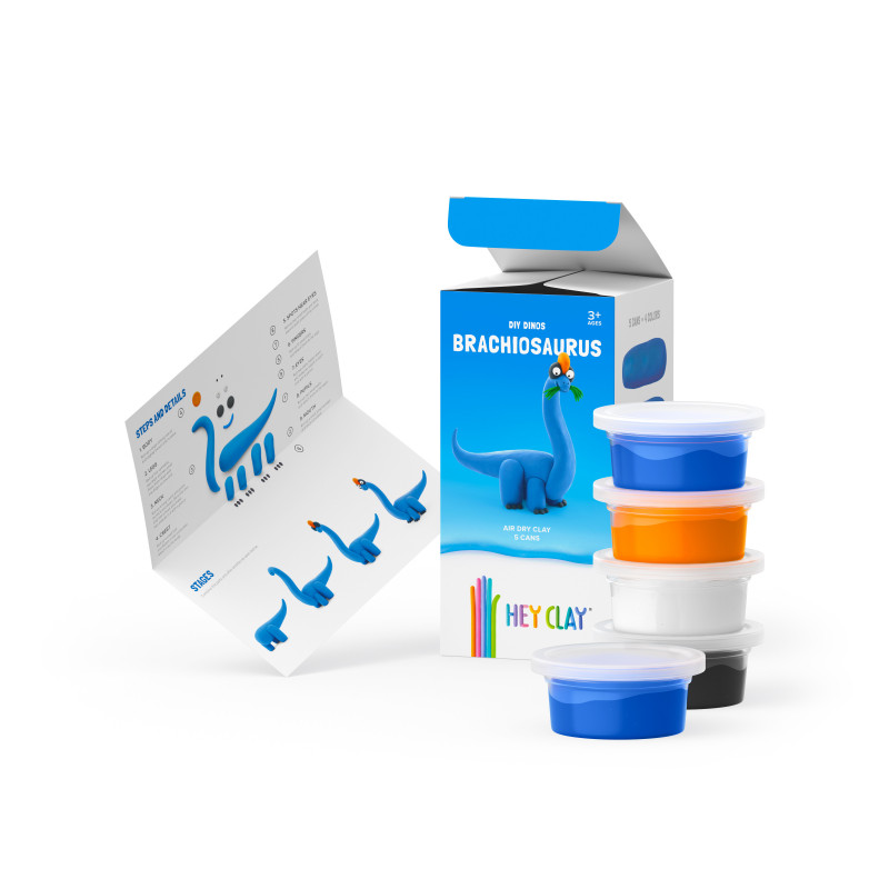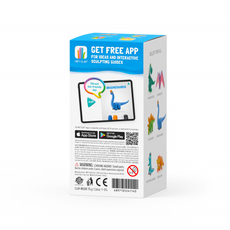 Innehåll: 5 burkar lufttorkande lera (totalt ca 75 g lera i 4 färger) samt ett informationsblad med bilder på dinosaurien, de olika stegen som krävs för att skulptera den, en länk till där ni kan hämta appen och koden som låser upp appens guide för hur man skapar en brachiosaurus.